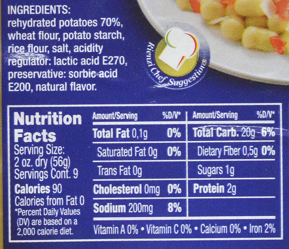 Rehydrated potatoes 70%, wheat flour, potato starch, rice flour, salt, acidity regulator, lactic acid E270, preservative: sorbic acid, E200 natural flavor. |