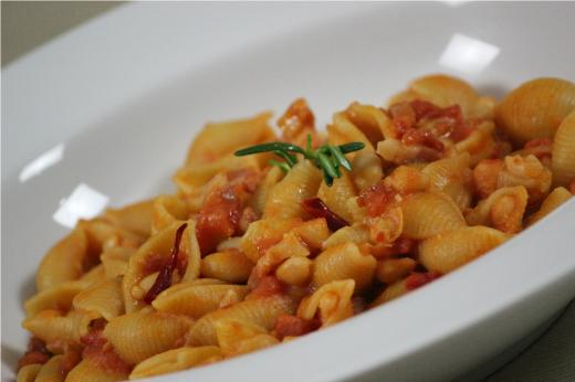 - In a large pan add some olive oil and sauté` the garlic. Once the garlic turns golden add the rosemary and the Pancetta cut in small cubes.
